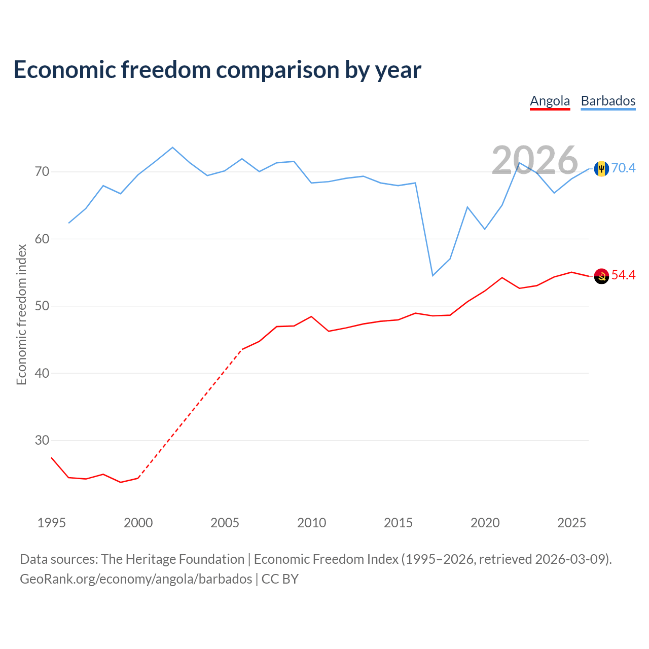 The Economic Freedom Index for Angola is 54.4, ranking 133/197, compared to 70.4 for Barbados, ranking 34/197. The chart above displays a comparison of annual changes in economic freedom indexes.