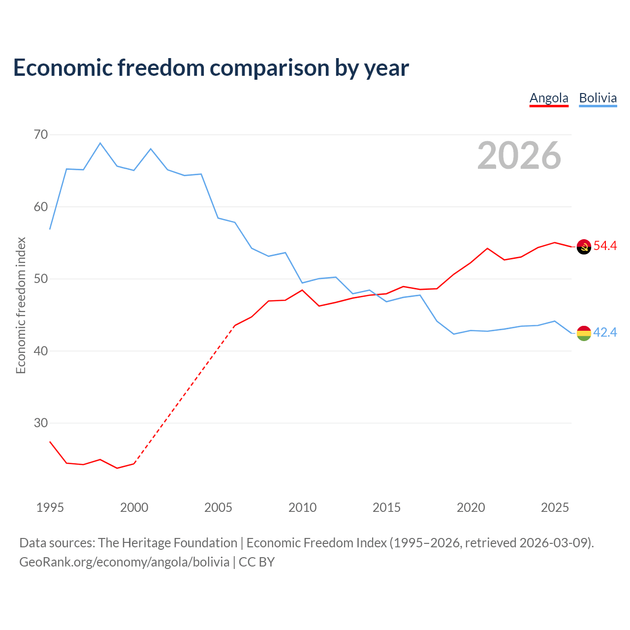 The Economic Freedom Index for Angola is 54.4, ranking 133/197, compared to 42.4 for Bolivia, ranking 184/197. The chart above displays a comparison of annual changes in economic freedom indexes.