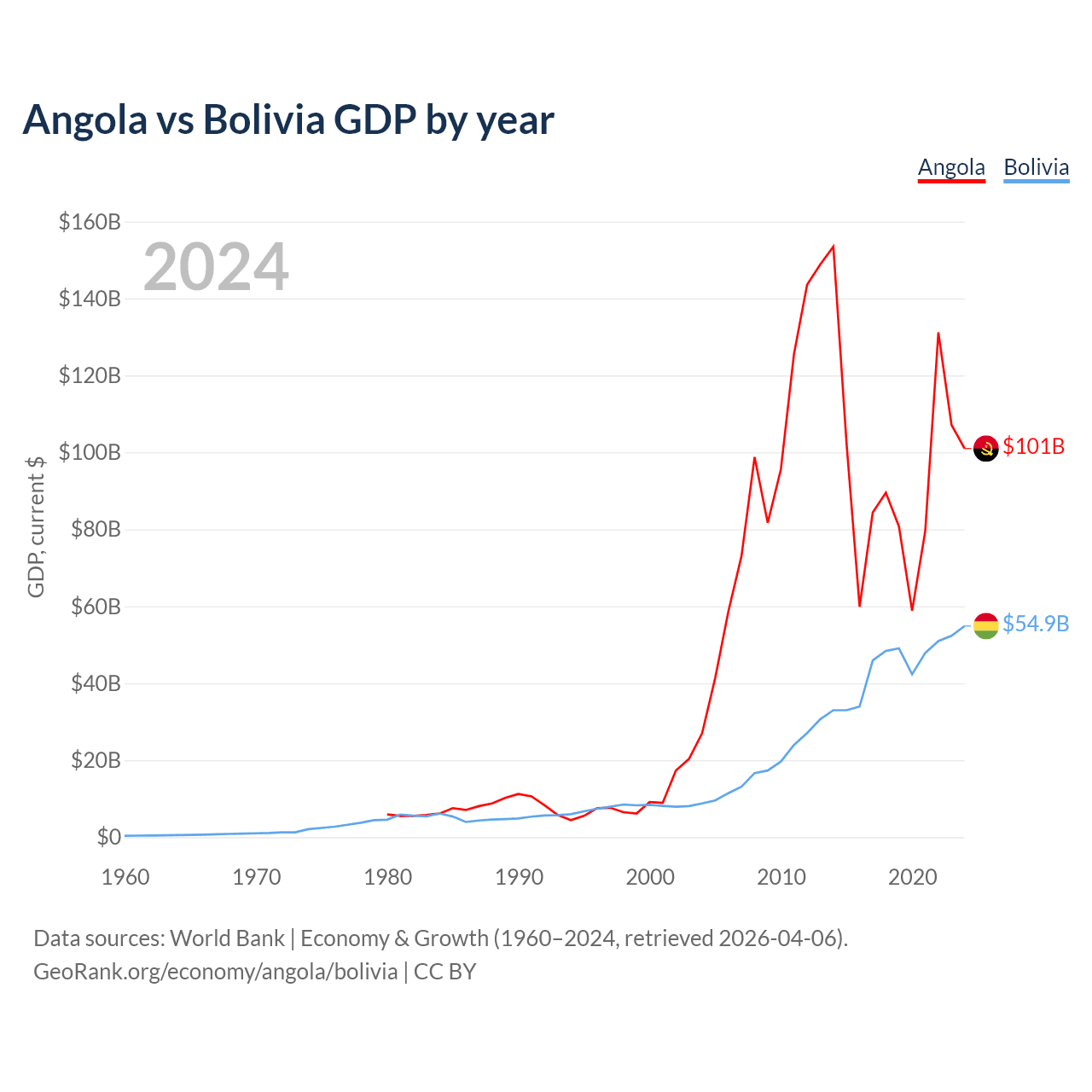 Angola vs Bolivia GDP by year