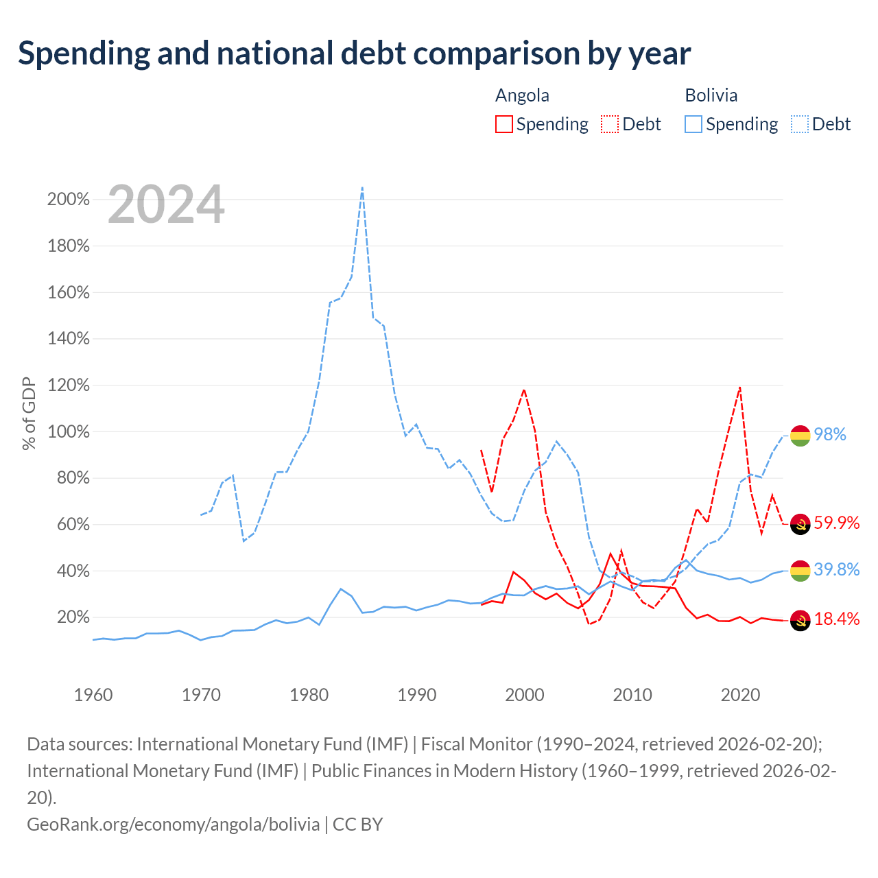 Angola has $60.5B in government debt (59.9% of GDP), compared to $53.8B (98% of GDP) in Bolivia.