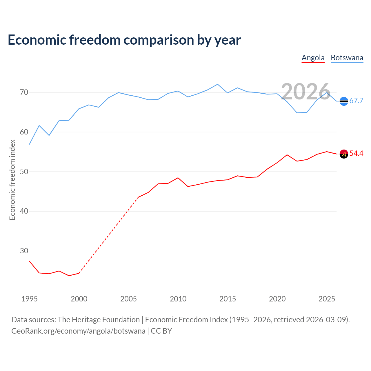 The Economic Freedom Index for Angola is 54.4, ranking 133/197, compared to 67.7 for Botswana, ranking 53/197. The chart above displays a comparison of annual changes in economic freedom indexes.