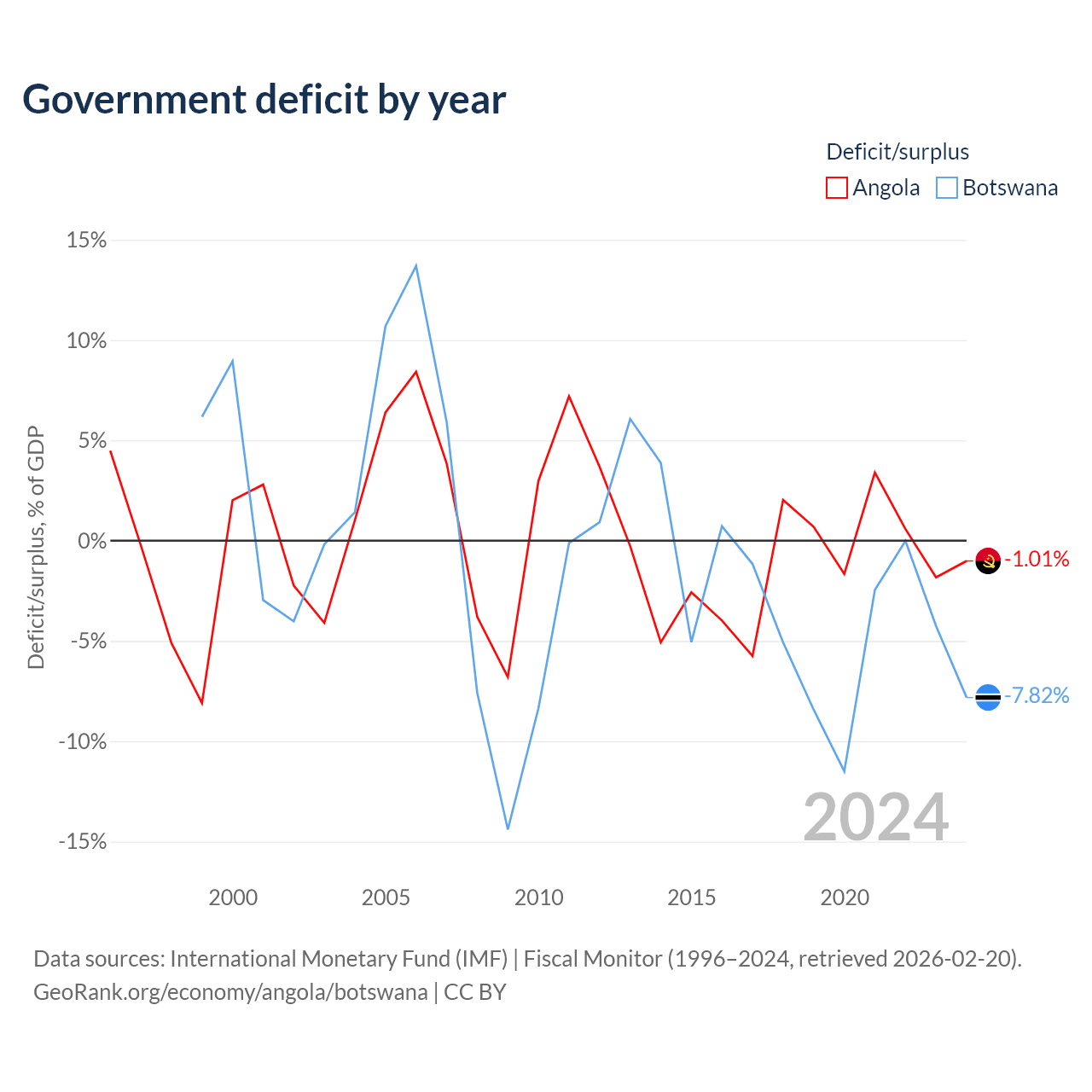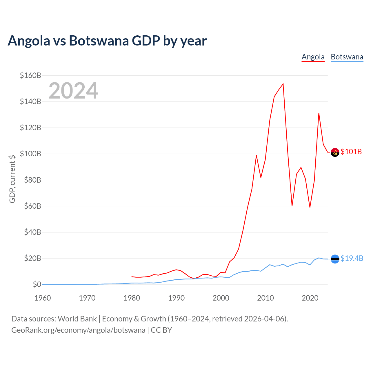 Angola has a GDP of $101B compared to $19.4B for Botswana, ranking 71/197 and 133/197 by economy size, respectively.