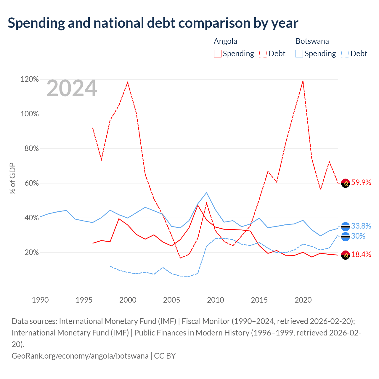 Angola has $60.5B in government debt (59.9% of GDP), compared to $5.82B (30% of GDP) in Botswana.