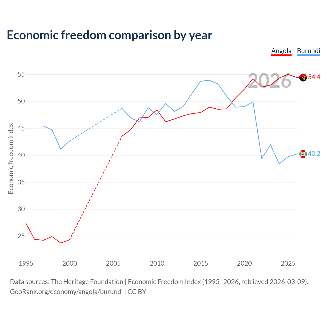 The Economic Freedom Index for Angola is 54.4, ranking 133/197, compared to 40.2 for Burundi, ranking 187/197. The chart above displays a comparison of annual changes in economic freedom indexes.