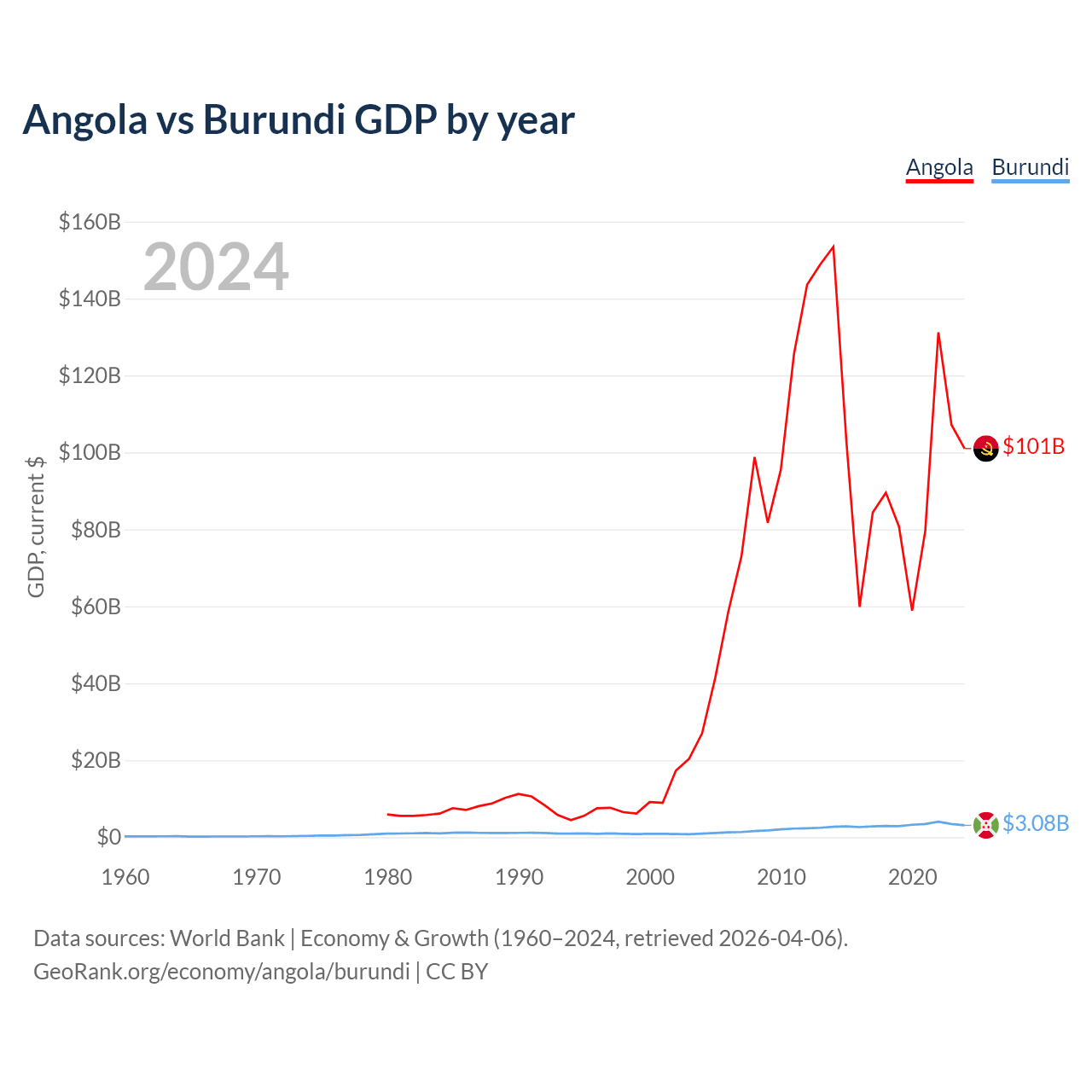 Angola has a GDP of $101B compared to $3.08B for Burundi, ranking 71/197 and 169/197 by economy size, respectively.