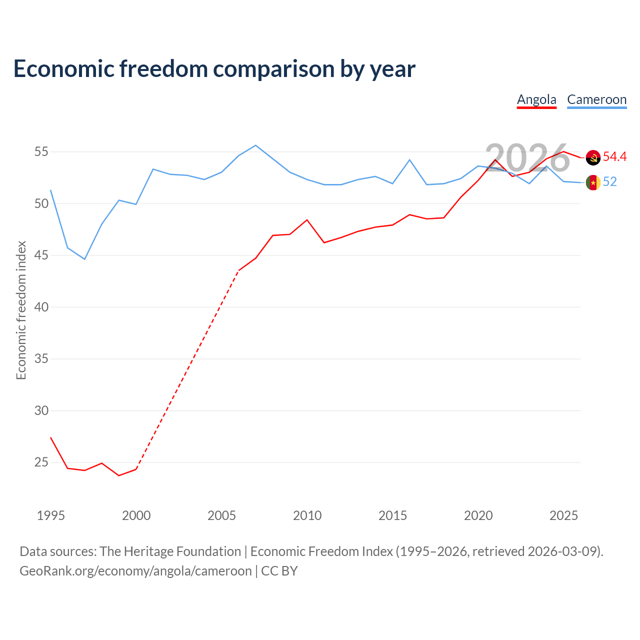 The Economic Freedom Index for Angola is 54.4, ranking 133/197, compared to 52 for Cameroon, ranking 151/197. The chart above displays a comparison of annual changes in economic freedom indexes.