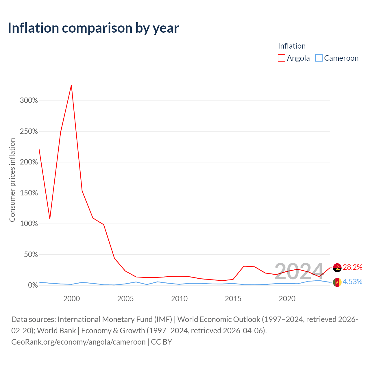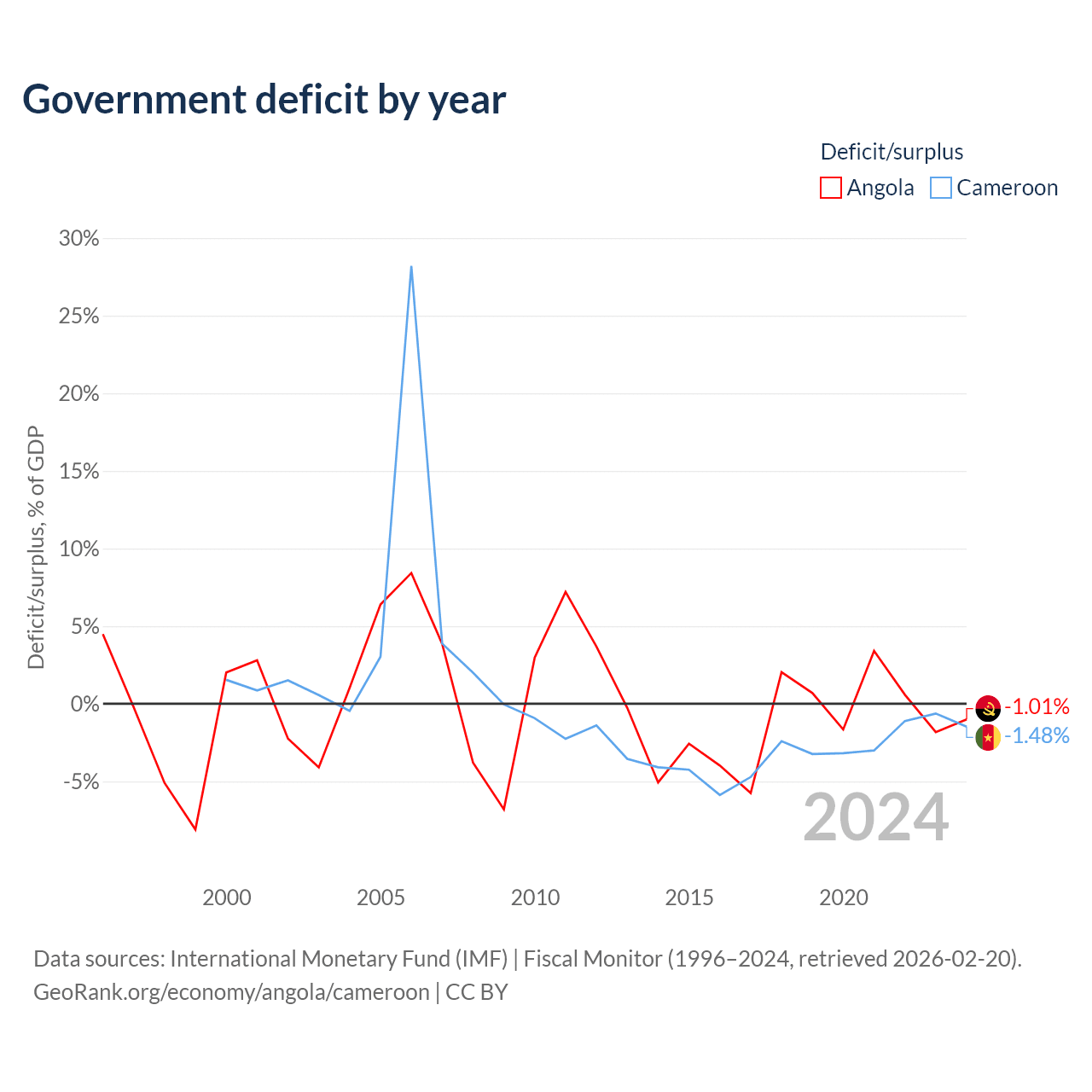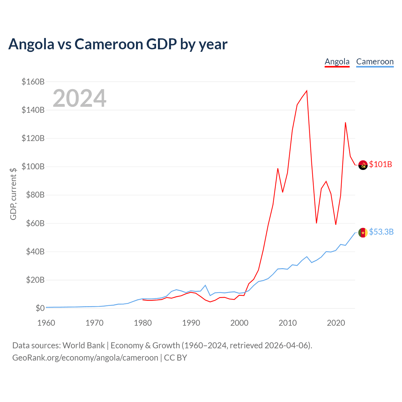 Angola has a GDP of $101B compared to $53.3B for Cameroon, ranking 71/197 and 91/197 by economy size, respectively.