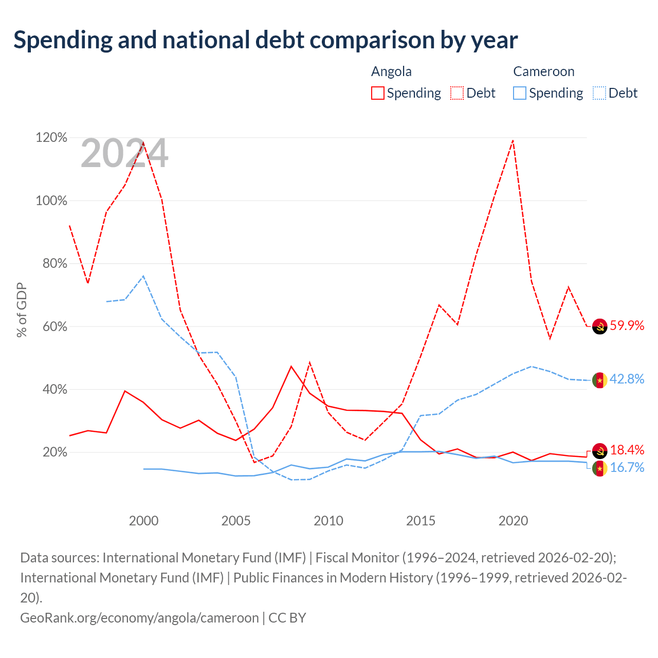 Angola has $60.5B in government debt (59.9% of GDP), compared to $22.8B (42.8% of GDP) in Cameroon.