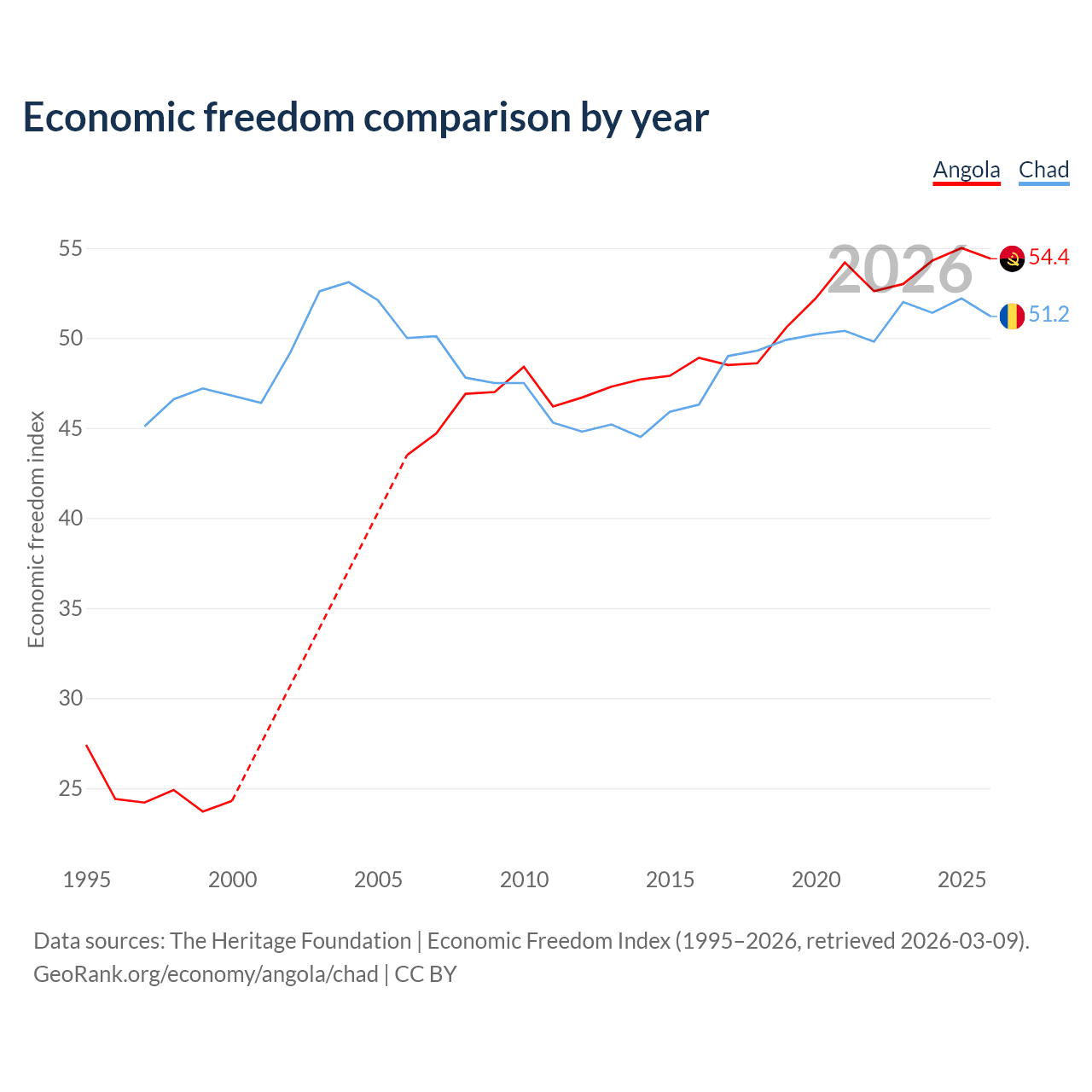 The Economic Freedom Index for Angola is 54.4, ranking 133/197, compared to 51.2 for Chad, ranking 154/197. The chart above displays a comparison of annual changes in economic freedom indexes.