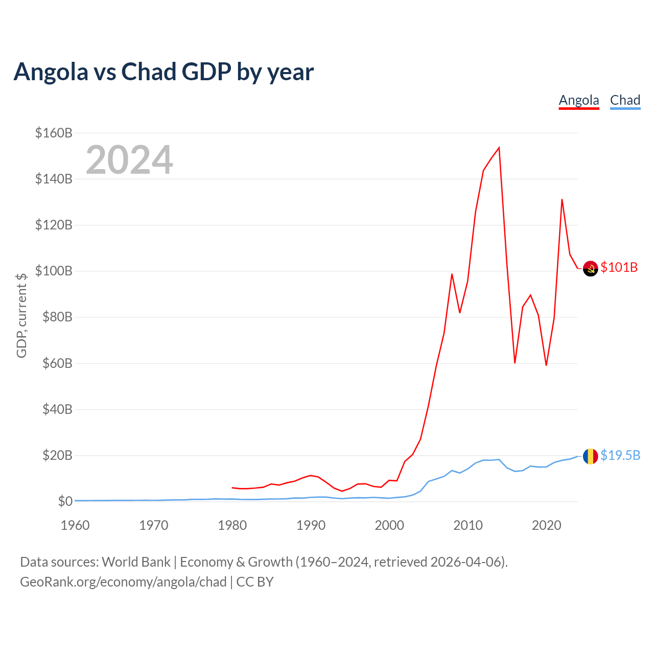 Angola has a GDP of $101B compared to $19.5B for Chad, ranking 71/197 and 132/197 by economy size, respectively.
