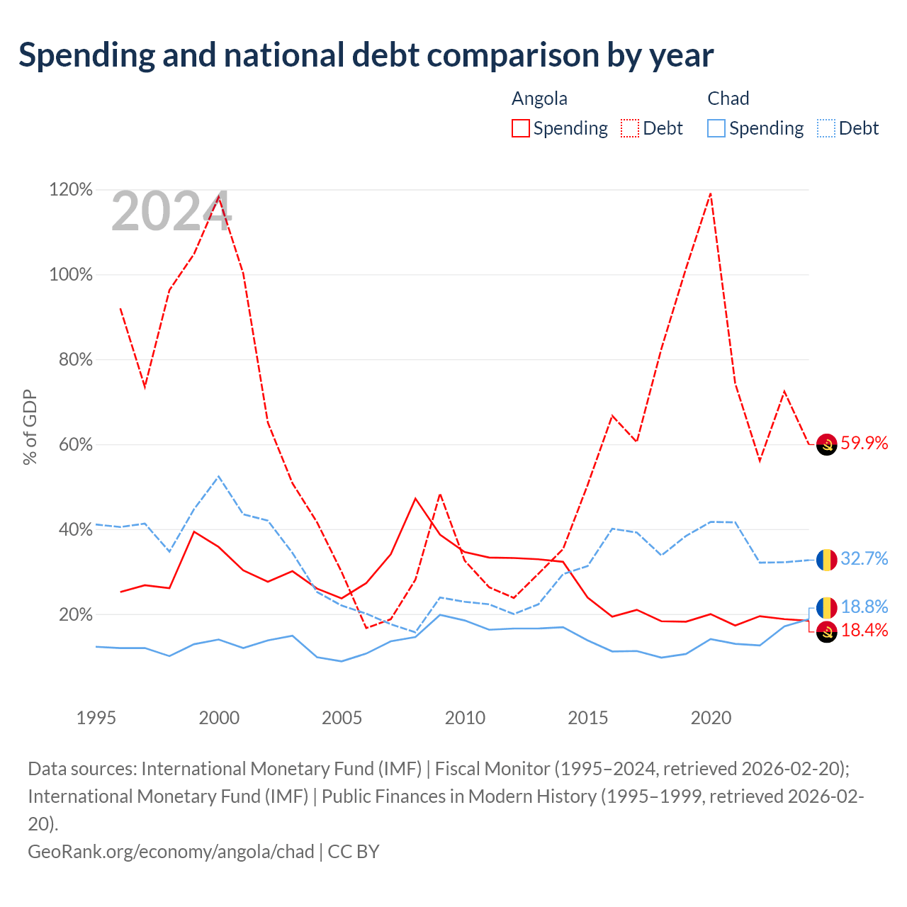 Angola has $60.5B in government debt (59.9% of GDP), compared to $6.37B (32.7% of GDP) in Chad.