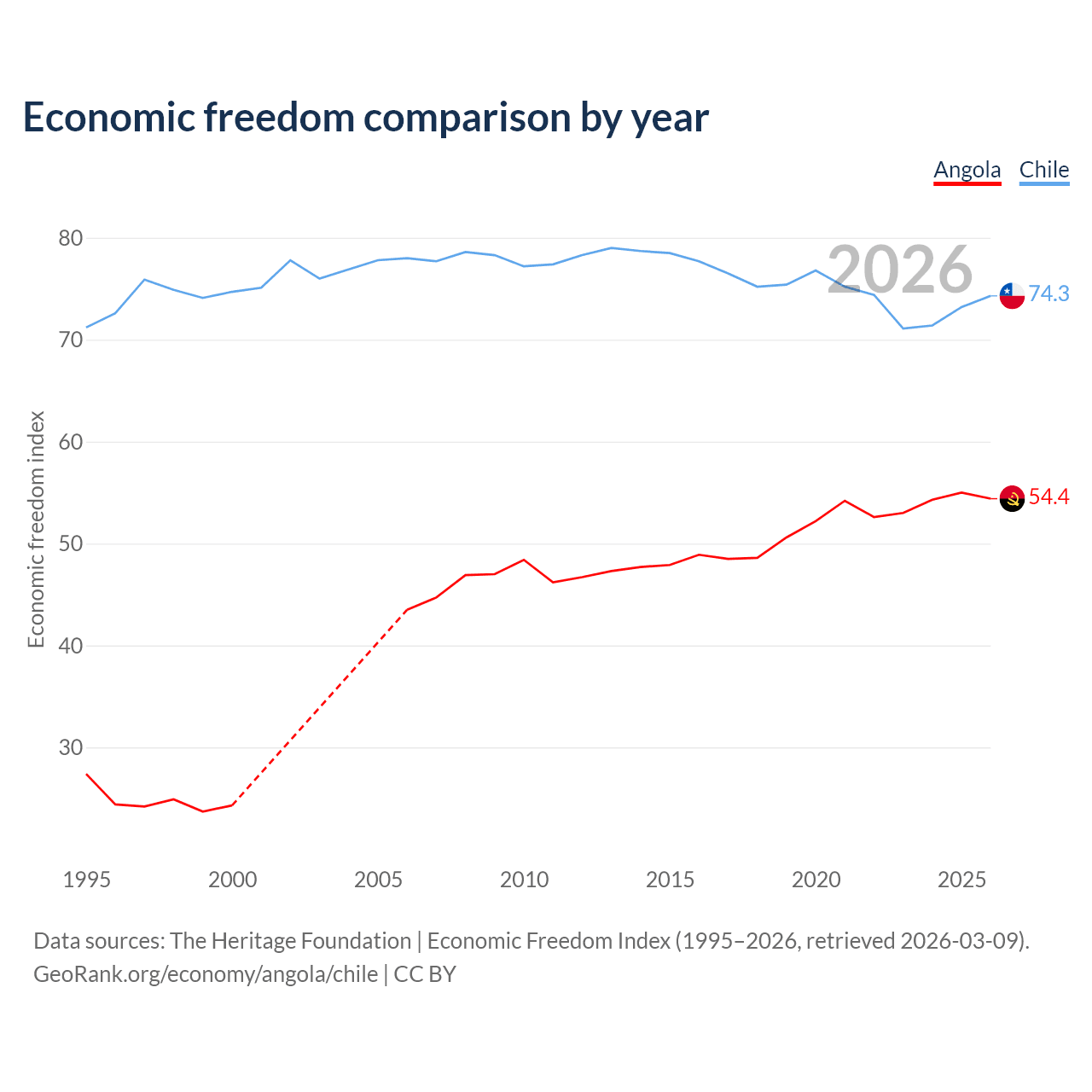 The Economic Freedom Index for Angola is 54.4, ranking 133/197, compared to 74.3 for Chile, ranking 20/197. The chart above displays a comparison of annual changes in economic freedom indexes.
