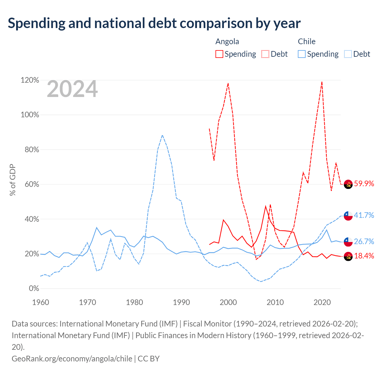 Angola has $60.5B in government debt (59.9% of GDP), compared to $138B (41.7% of GDP) in Chile.