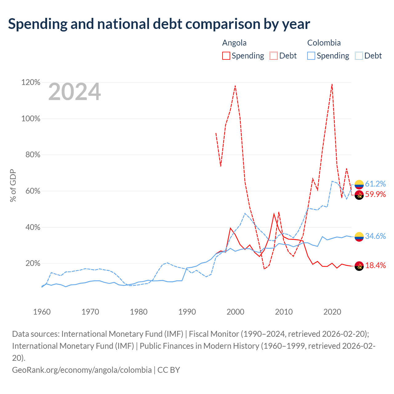 Angola has $60.5B in government debt (59.9% of GDP), compared to $256B (61.2% of GDP) in Colombia.