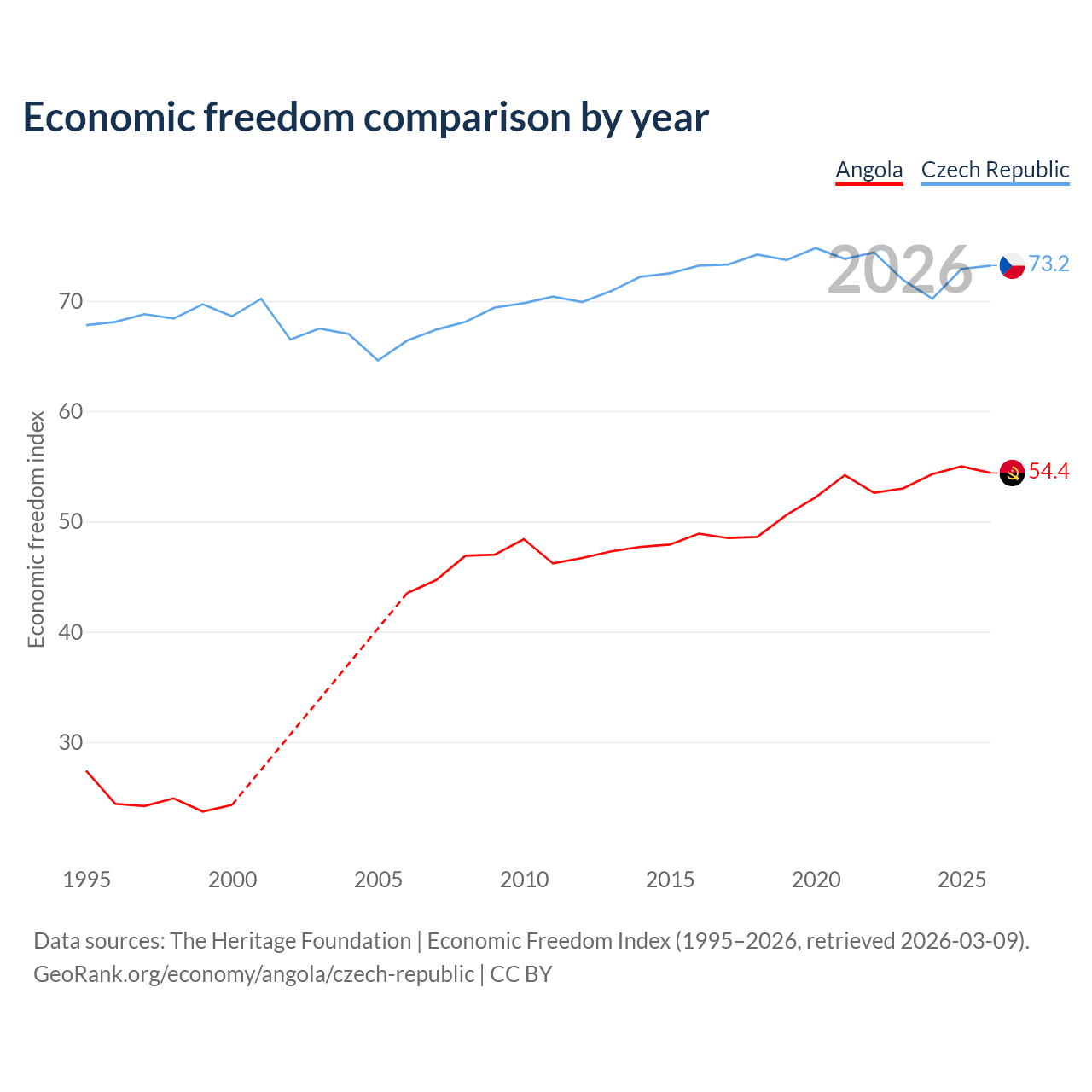 The Economic Freedom Index for Angola is 54.4, ranking 133/197, compared to 73.2 for the Czech Republic, ranking 25/197. The chart above displays a comparison of annual changes in economic freedom indexes.
