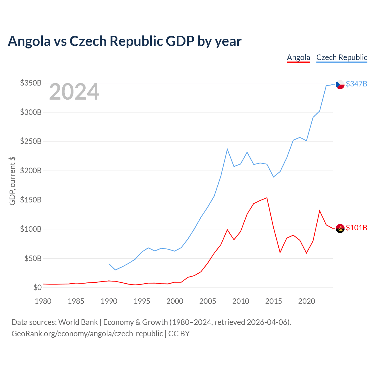 Angola has a GDP of $101B compared to $347B for the Czech Republic, ranking 71/197 and 44/197 by economy size, respectively.
