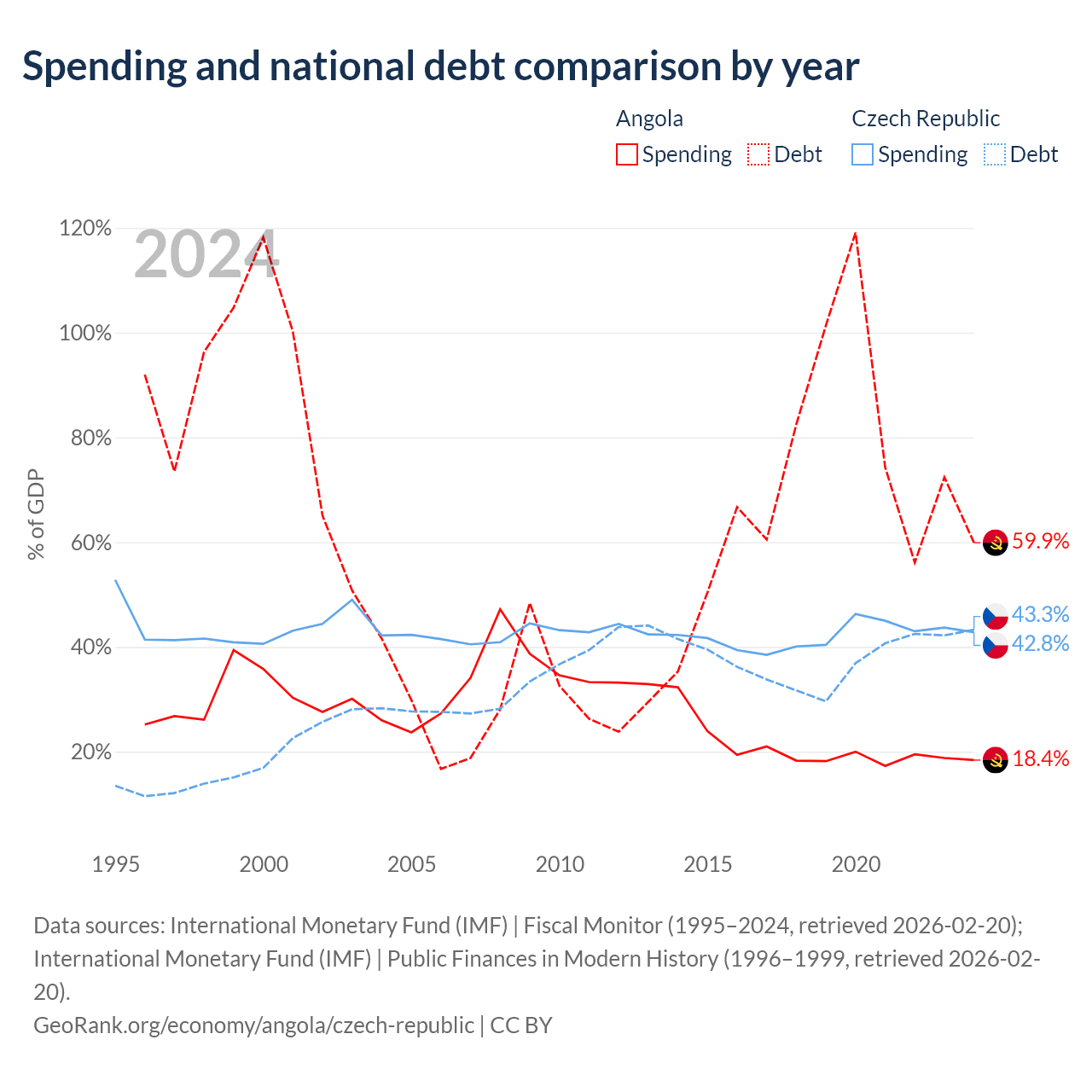 Angola has $60.5B in government debt (59.9% of GDP), compared to $150B (43.3% of GDP) in the Czech Republic.