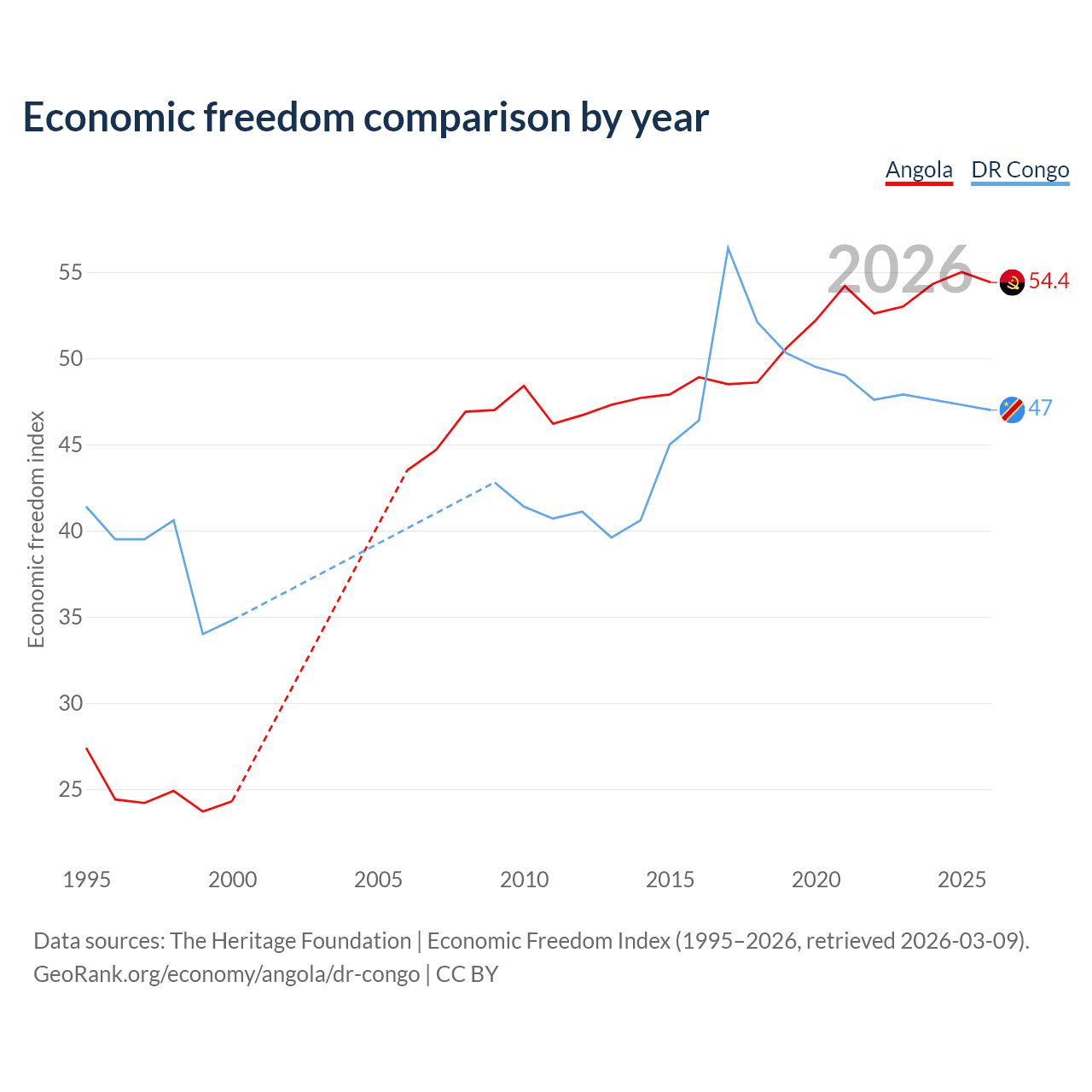 The Economic Freedom Index for Angola is 54.4, ranking 133/197, compared to 47 for the DR Congo, ranking 176/197. The chart above displays a comparison of annual changes in economic freedom indexes.