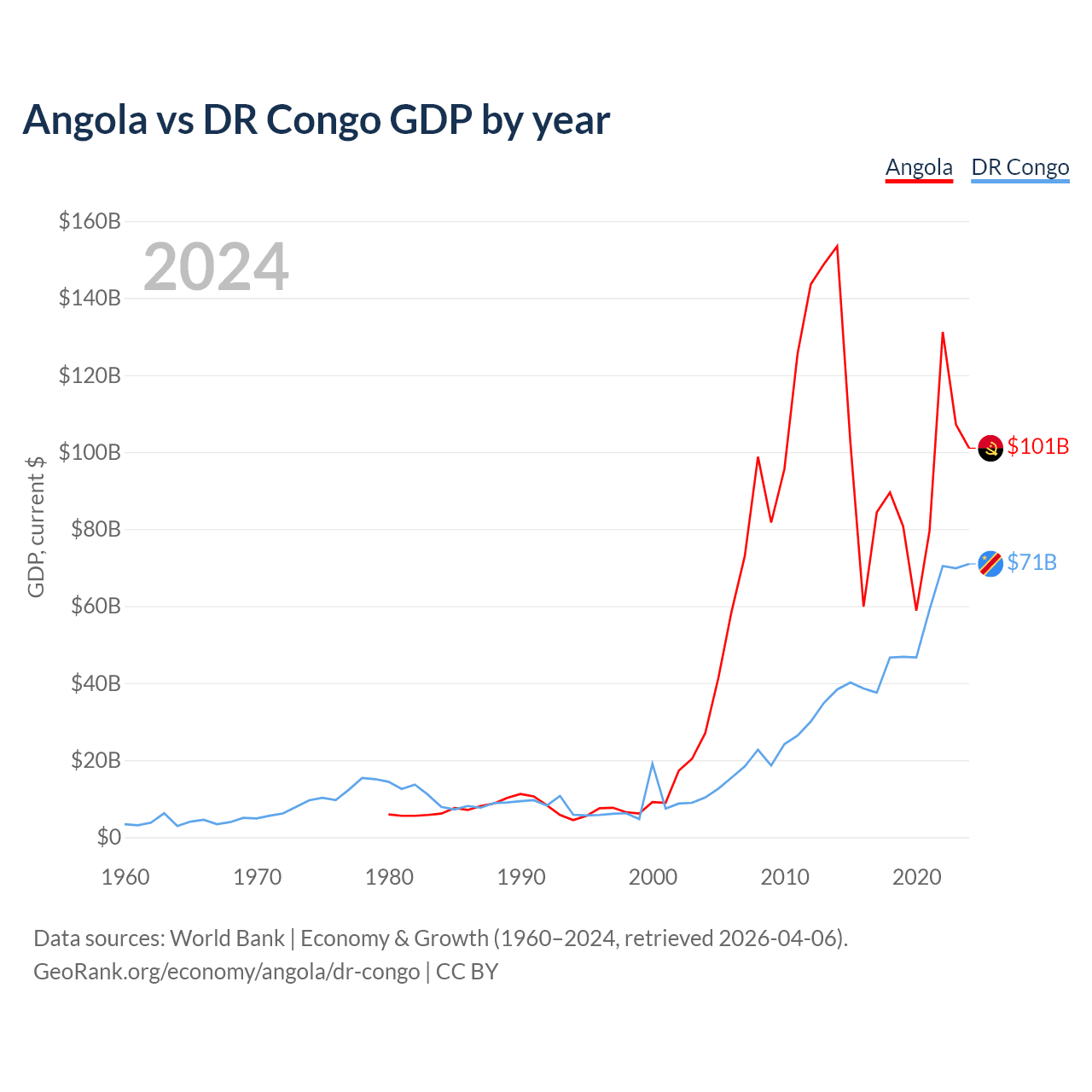 Angola has a GDP of $101B compared to $71B for the DR Congo, ranking 71/197 and 87/197 by economy size, respectively.