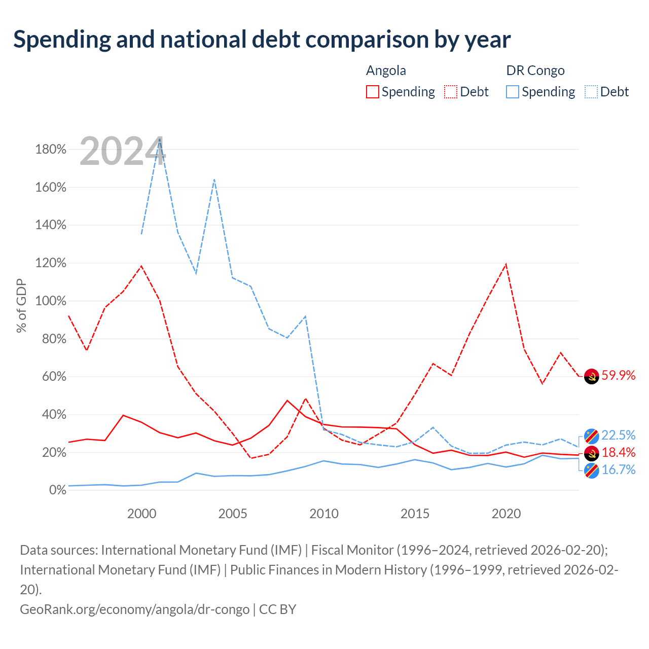 Angola has $60.5B in government debt (59.9% of GDP), compared to $16B (22.5% of GDP) in the DR Congo.