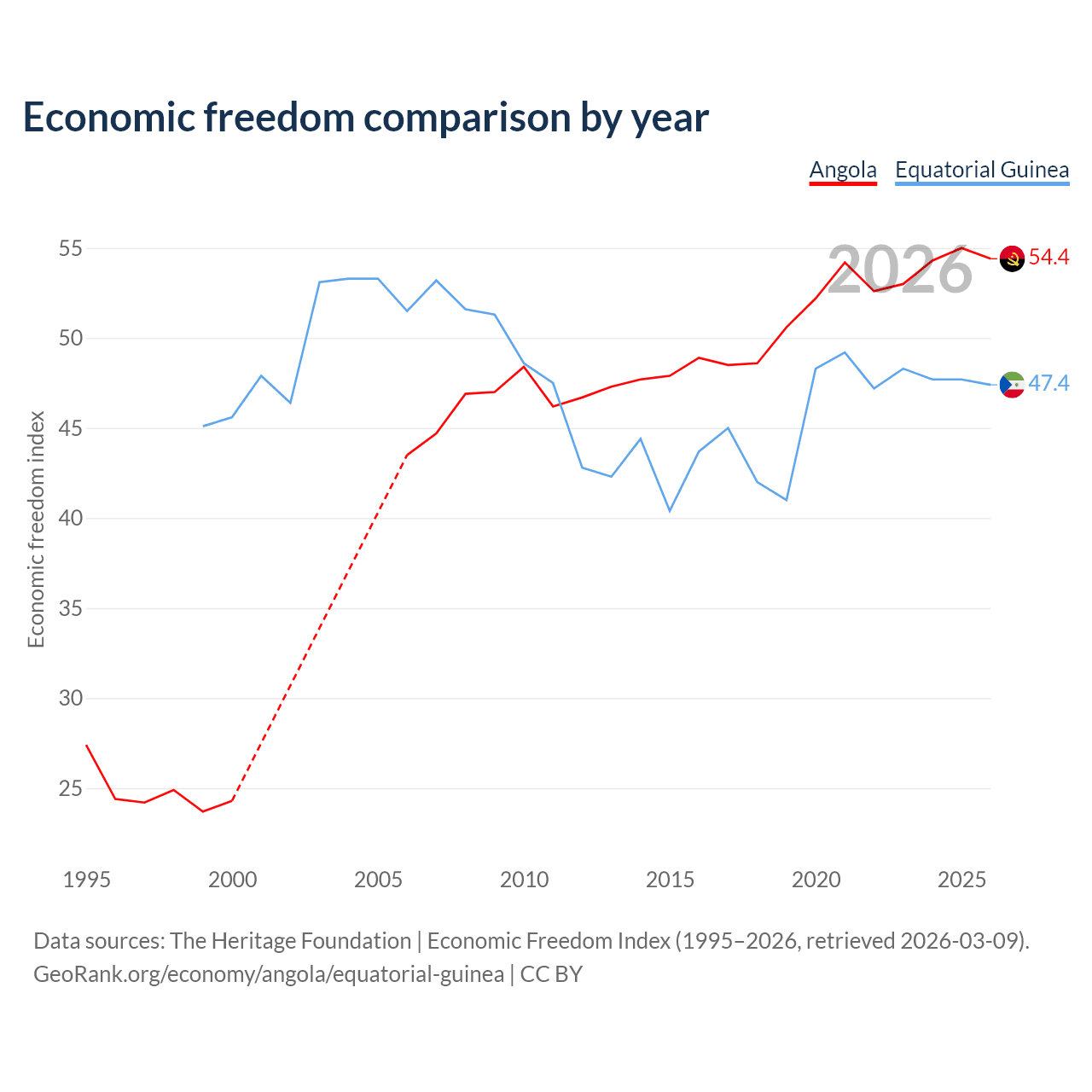 The Economic Freedom Index for Angola is 54.4, ranking 133/197, compared to 47.4 for Equatorial Guinea, ranking 175/197. The chart above displays a comparison of annual changes in economic freedom indexes.