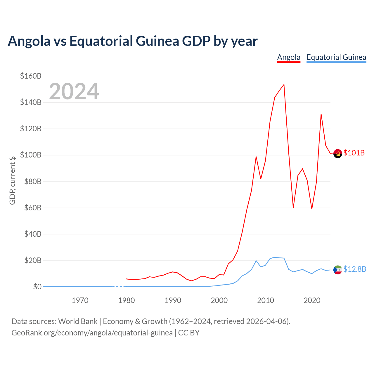Angola has a GDP of $101B compared to $12.8B for Equatorial Guinea, ranking 71/197 and 148/197 by economy size, respectively.