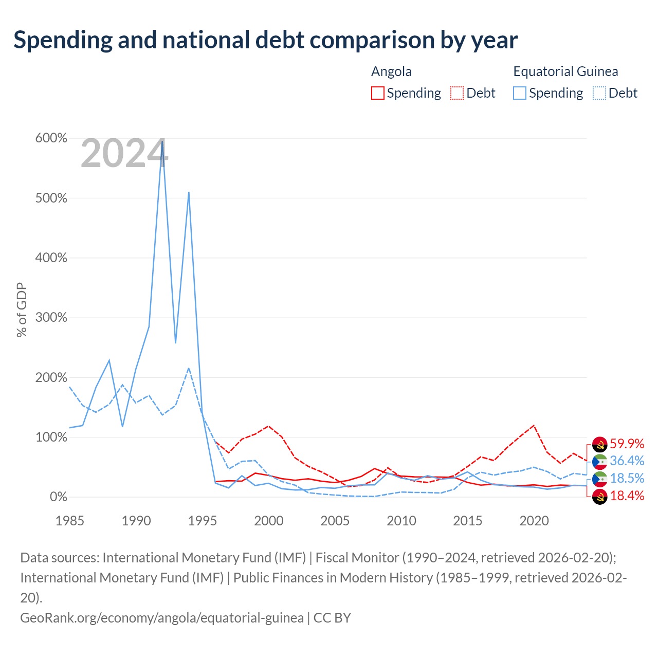 Angola has $60.5B in government debt (59.9% of GDP), compared to $4.65B (36.4% of GDP) in Equatorial Guinea.