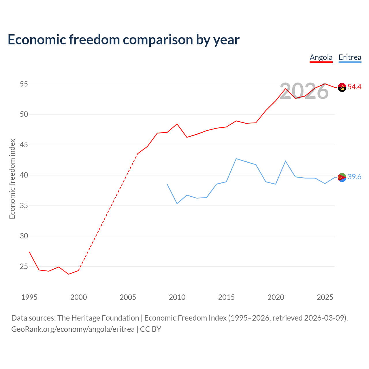 The Economic Freedom Index for Angola is 54.4, ranking 133/197, compared to 39.6 for Eritrea, ranking 188/197. The chart above displays a comparison of annual changes in economic freedom indexes.