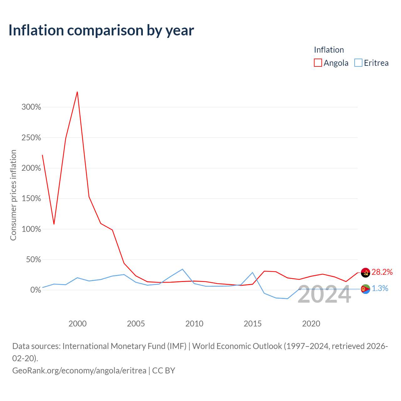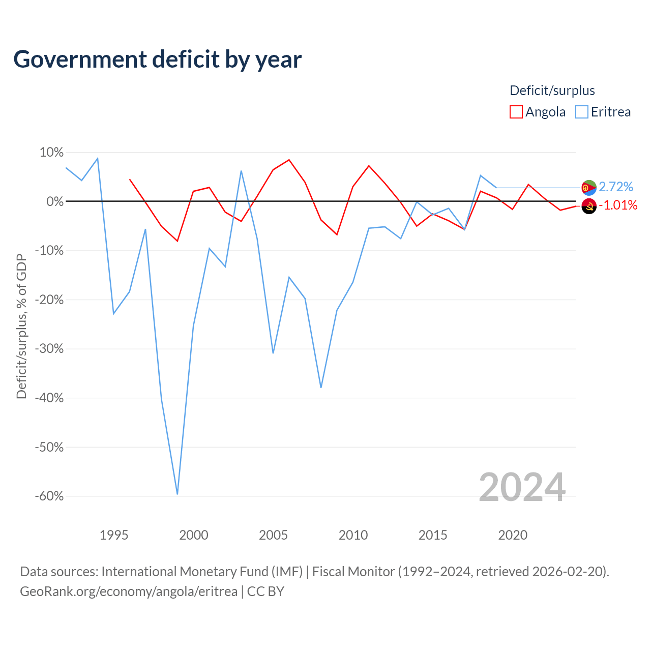 Angola has a GDP of $101B compared to $2.07B for Eritrea, ranking 71/197 and 179/197 by economy size, respectively.