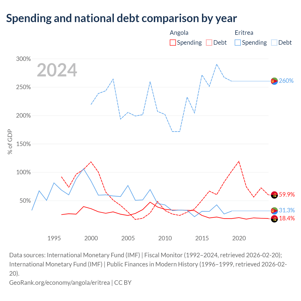 Angola has $60.5B in government debt (59.9% of GDP), compared to $3.54B (260.4% of GDP) in Eritrea.