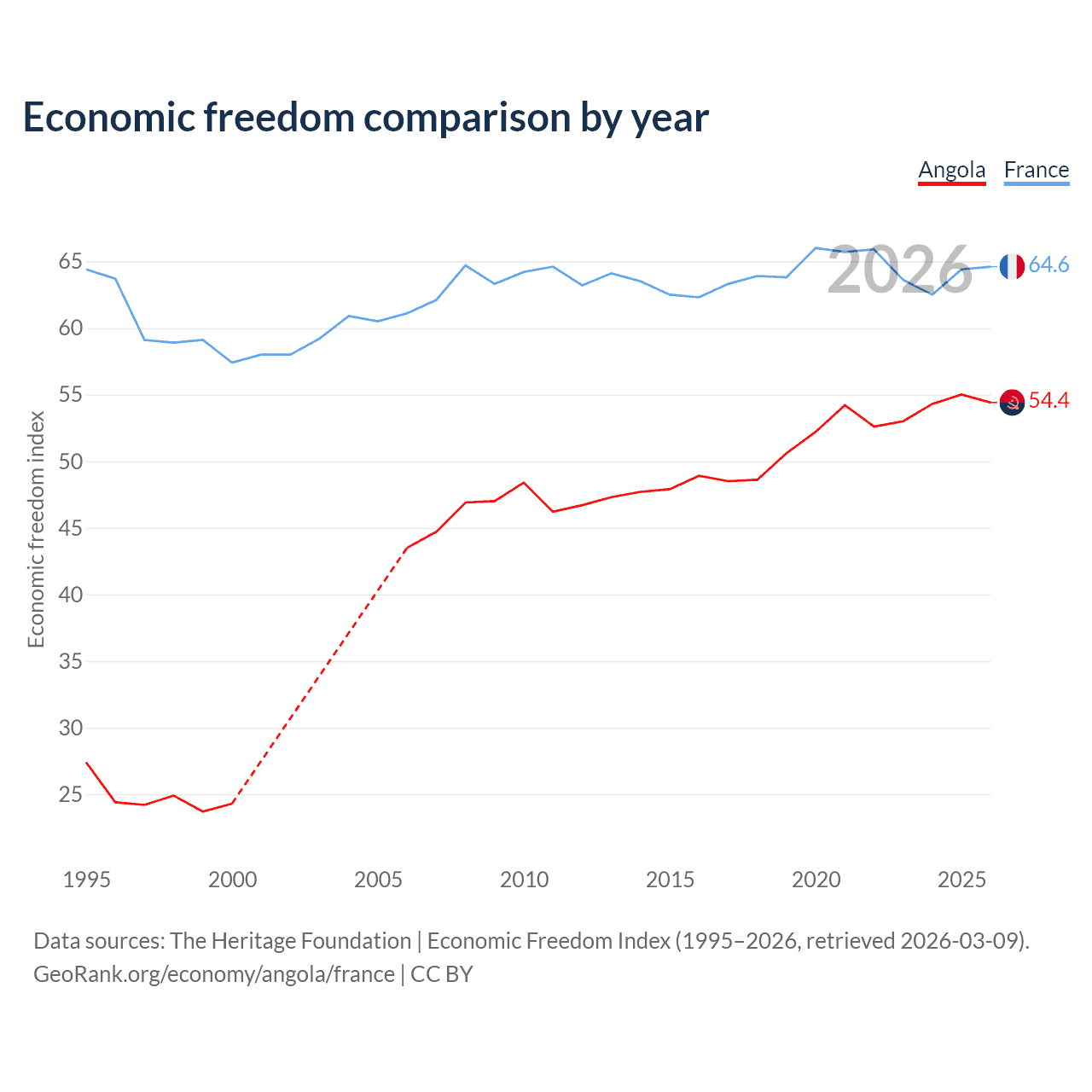 The Economic Freedom Index for Angola is 54.4, ranking 133/197, compared to 64.6 for France, ranking 72/197. The chart above displays a comparison of annual changes in economic freedom indexes.