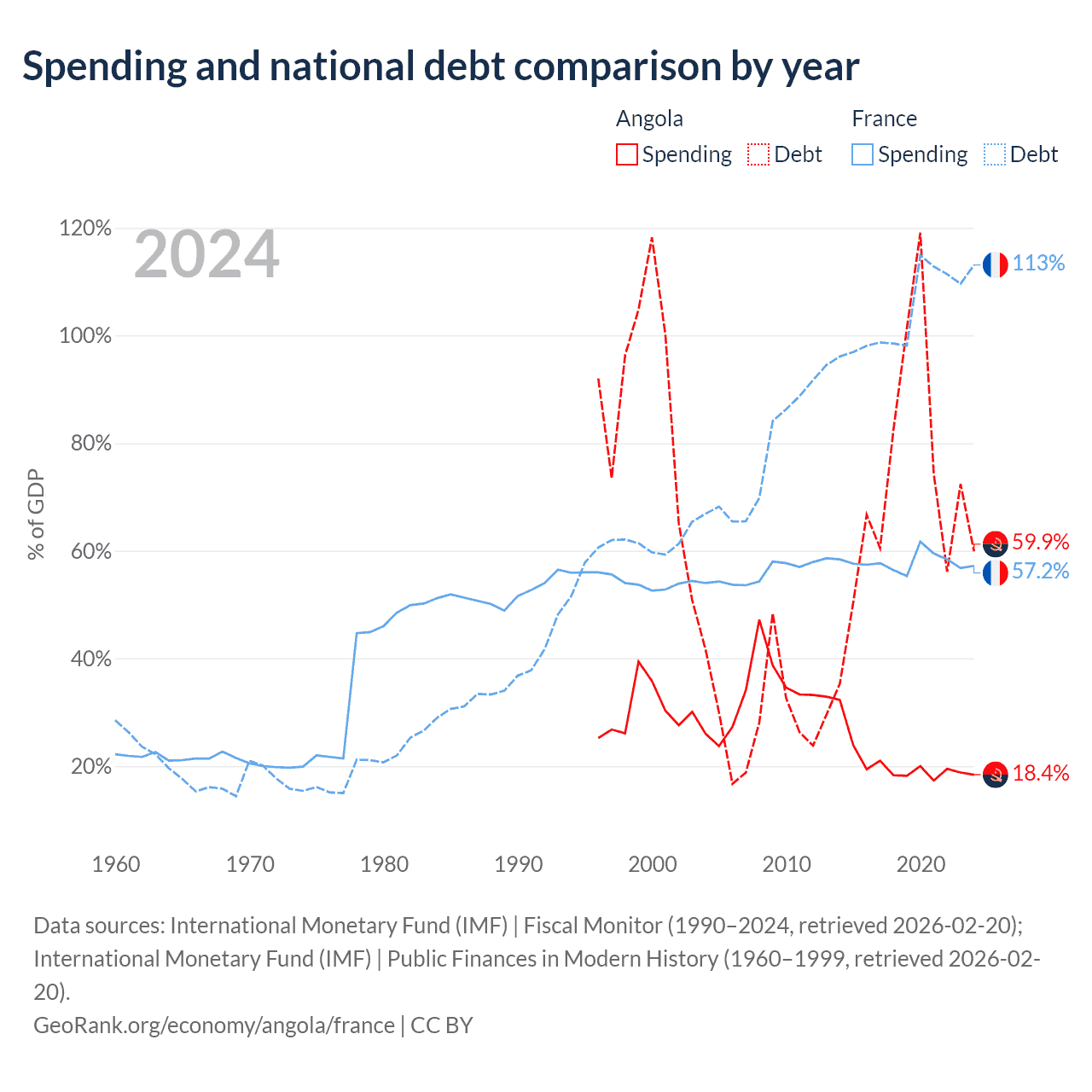 Angola has $60.5B in government debt (59.9% of GDP), compared to $3.58T (113.1% of GDP) in France.