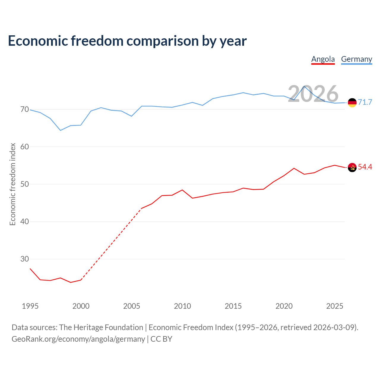 The Economic Freedom Index for Angola is 54.4, ranking 133/197, compared to 71.7 for Germany, ranking 30/197. The chart above displays a comparison of annual changes in economic freedom indexes.