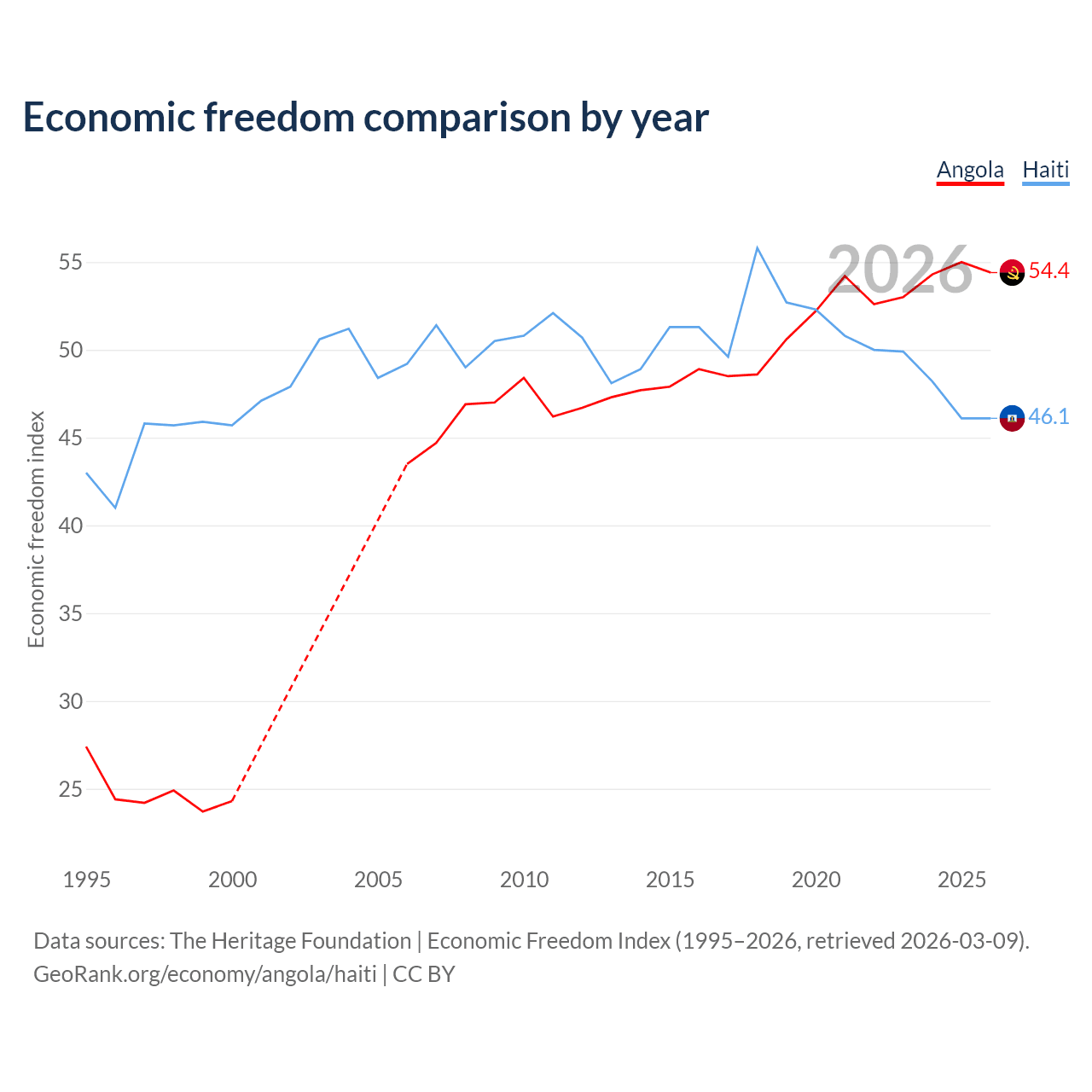 The Economic Freedom Index for Angola is 54.4, ranking 133/197, compared to 46.1 for Haiti, ranking 178/197. The chart above displays a comparison of annual changes in economic freedom indexes.