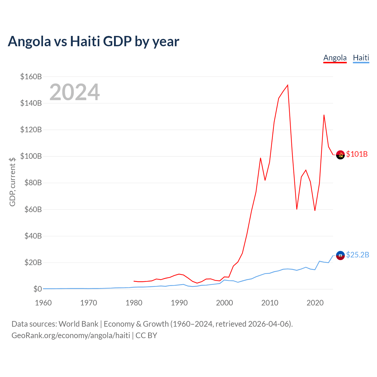 Angola has a GDP of $101B compared to $25.2B for Haiti, ranking 71/197 and 117/197 by economy size, respectively.
