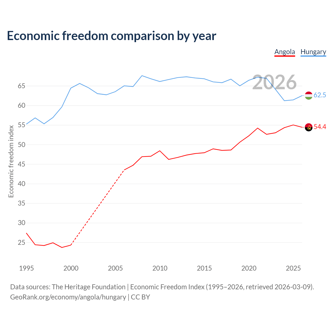 The Economic Freedom Index for Angola is 54.4, ranking 133/197, compared to 62.5 for Hungary, ranking 86/197. The chart above displays a comparison of annual changes in economic freedom indexes.