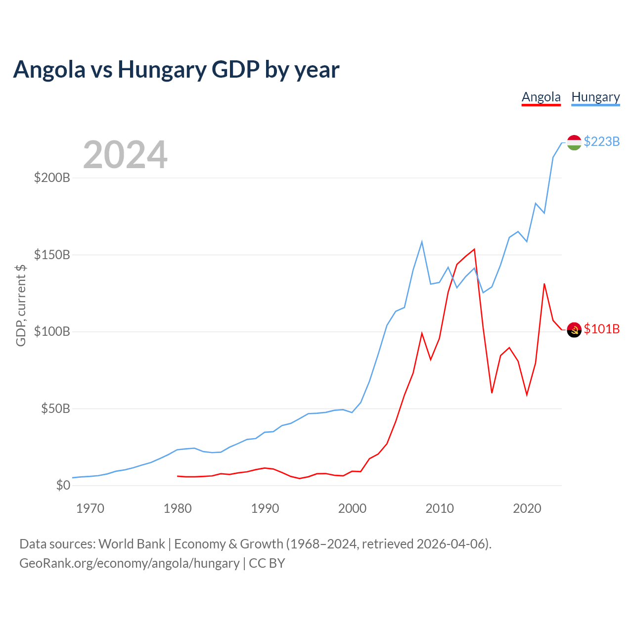 Angola has a GDP of $101B compared to $223B for Hungary, ranking 71/197 and 55/197 by economy size, respectively.