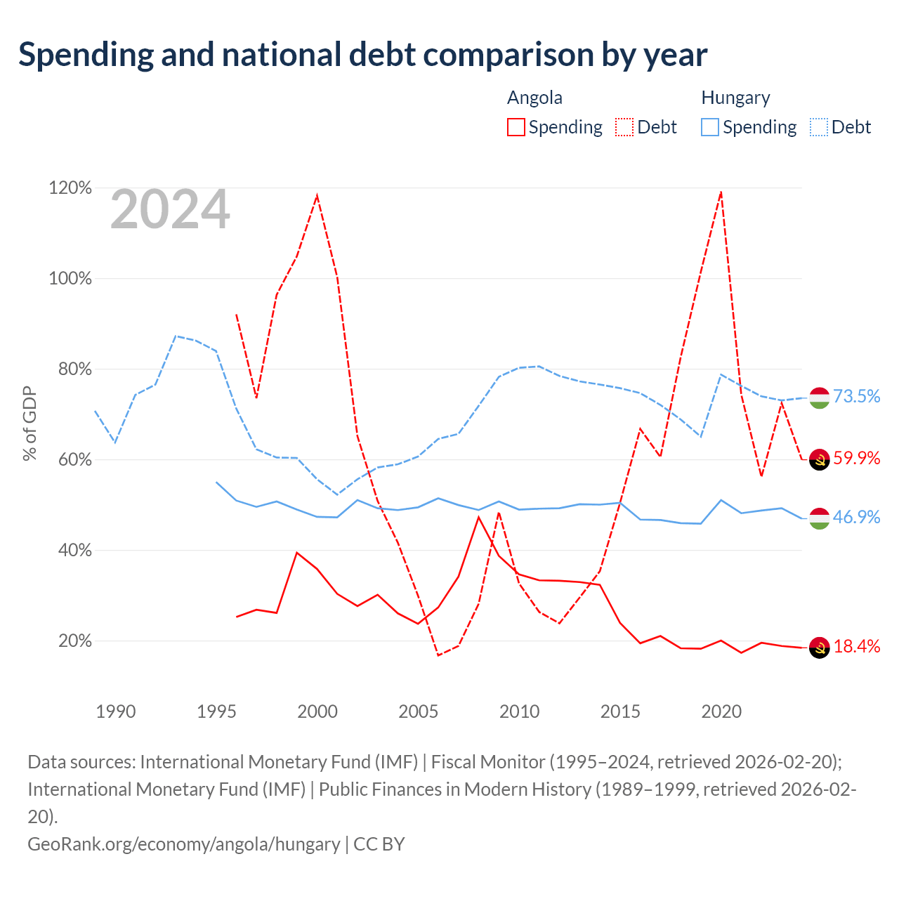 Angola has $60.5B in government debt (59.9% of GDP), compared to $164B (73.5% of GDP) in Hungary.