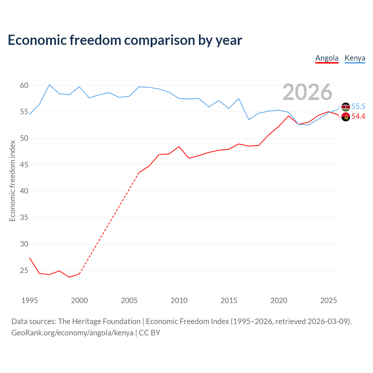 The Economic Freedom Index for Angola is 54.4, ranking 133/197, compared to 55.5 for Kenya, ranking 128/197. The chart above displays a comparison of annual changes in economic freedom indexes.