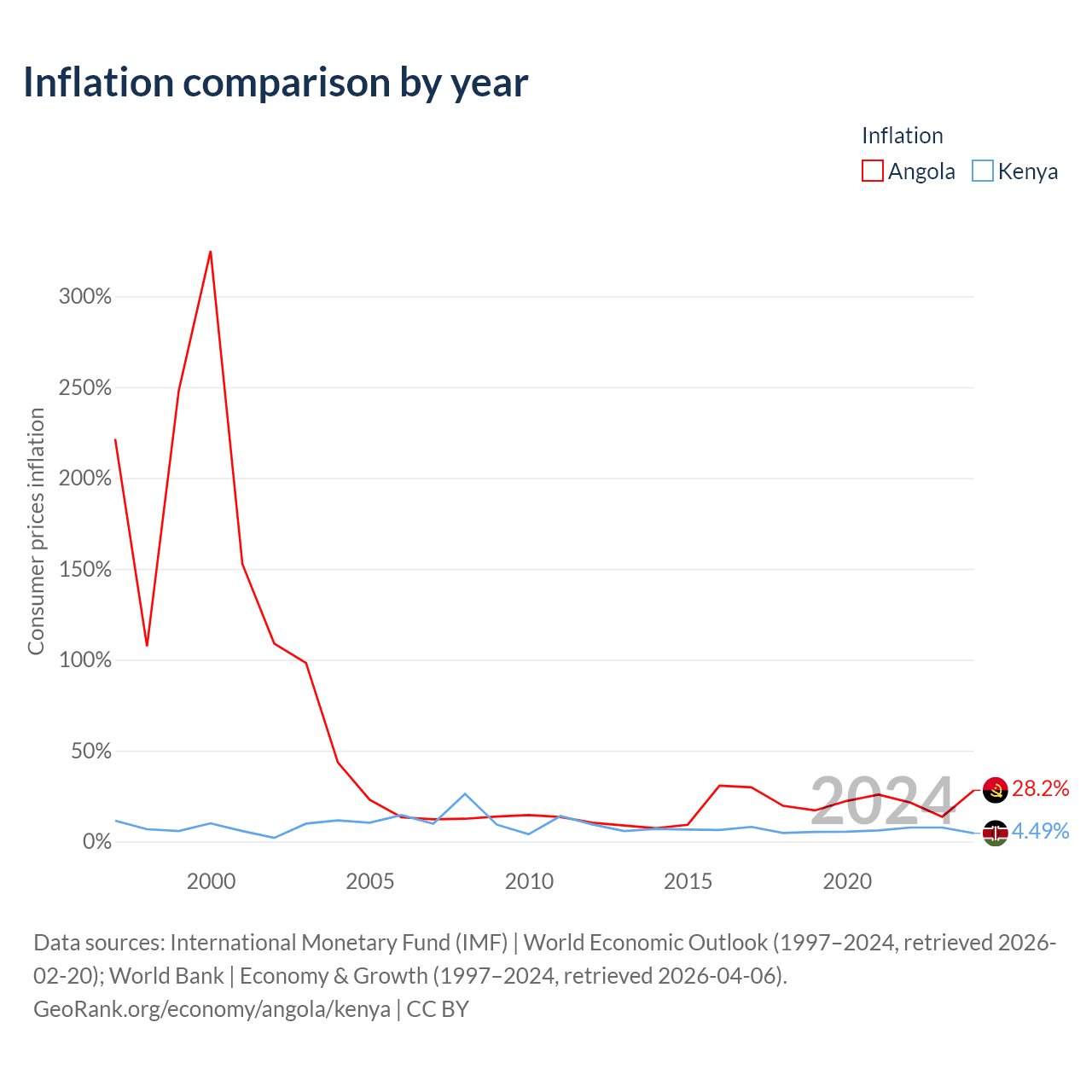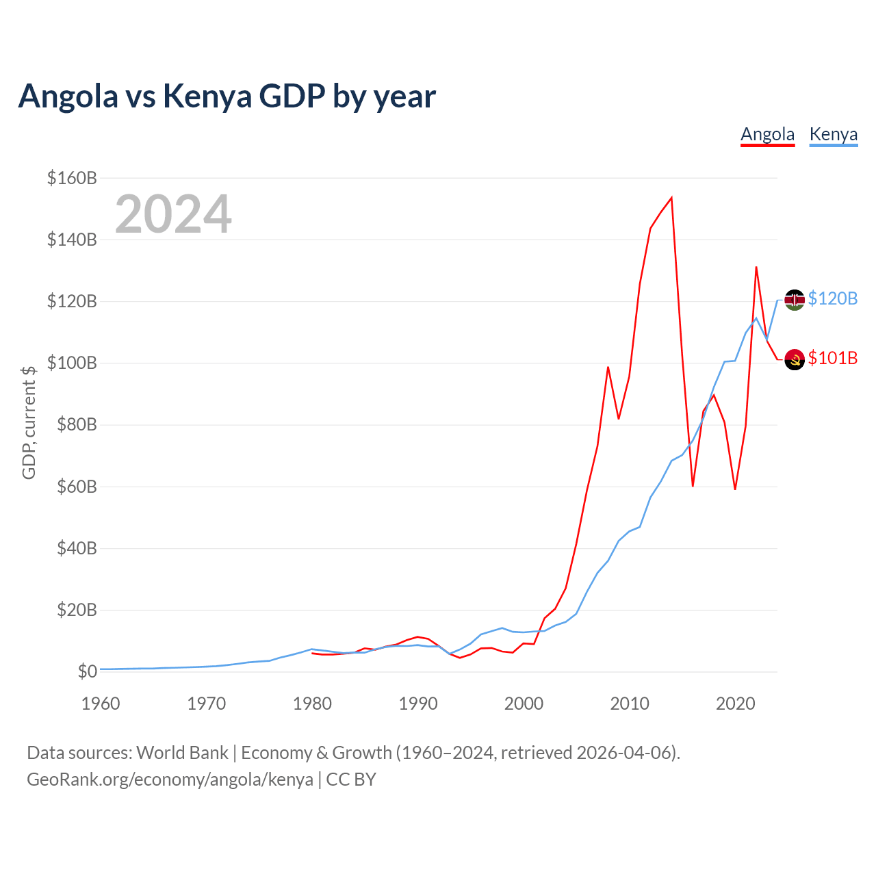 Angola has a GDP of $101B compared to $120B for Kenya, ranking 71/197 and 64/197 by economy size, respectively.
