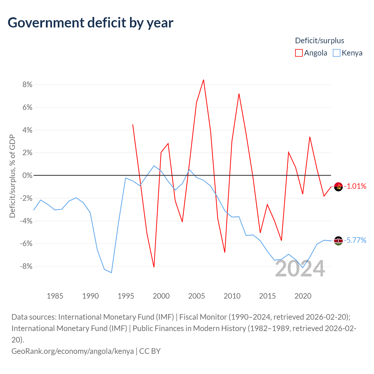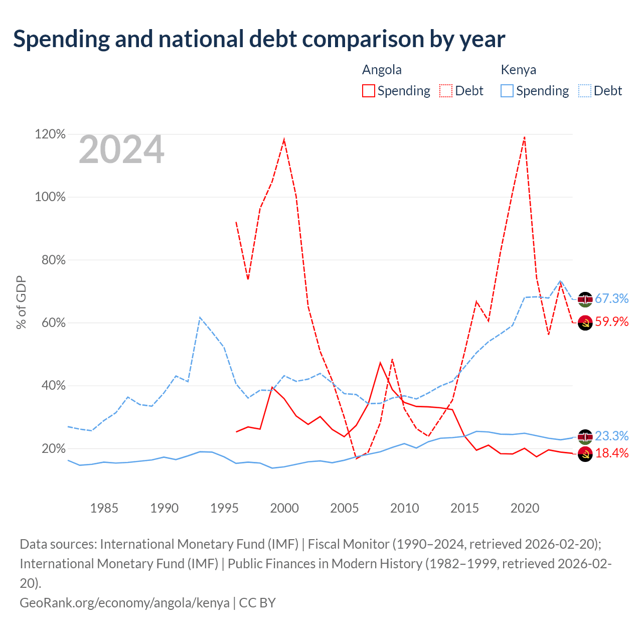 Angola has $60.5B in government debt (59.9% of GDP), compared to $81B (67.3% of GDP) in Kenya.