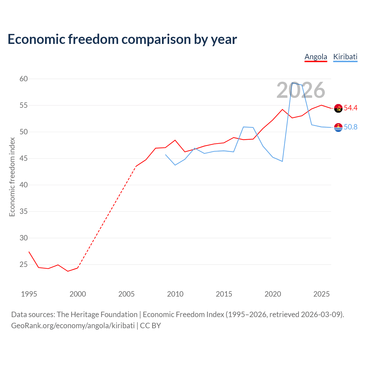The Economic Freedom Index for Angola is 54.4, ranking 133/197, compared to 50.8 for Kiribati, ranking 158/197. The chart above displays a comparison of annual changes in economic freedom indexes.
