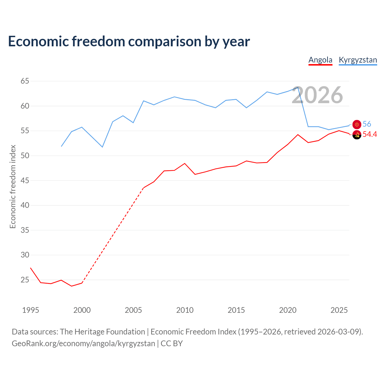 The Economic Freedom Index for Angola is 54.4, ranking 133/197, compared to 56 for Kyrgyzstan, ranking 126/197. The chart above displays a comparison of annual changes in economic freedom indexes.