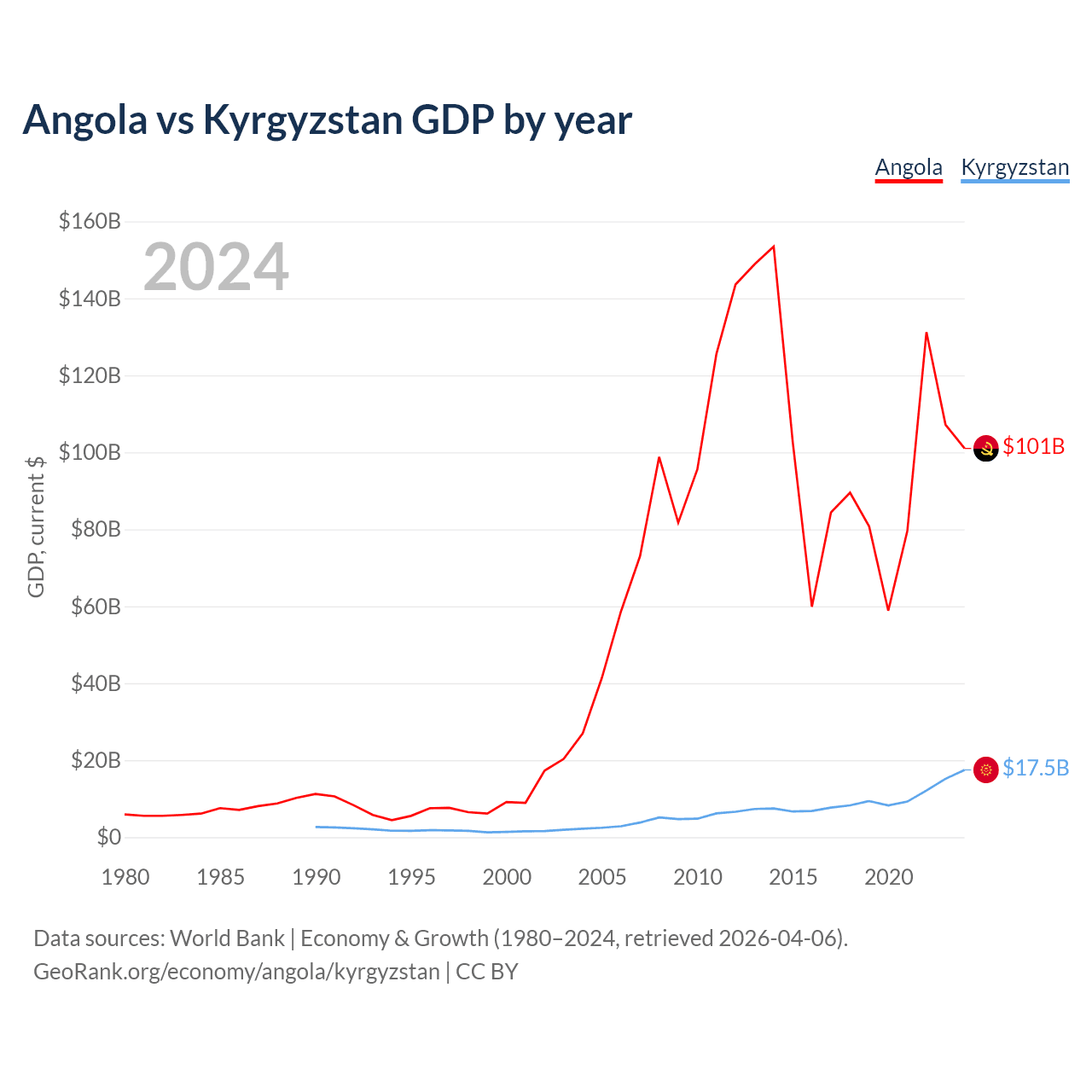Angola has a GDP of $101B compared to $17.5B for Kyrgyzstan, ranking 71/197 and 135/197 by economy size, respectively.