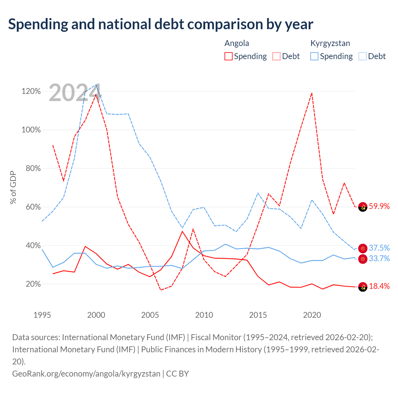 Angola has $60.5B in government debt (59.9% of GDP), compared to $6.56B (37.5% of GDP) in Kyrgyzstan.