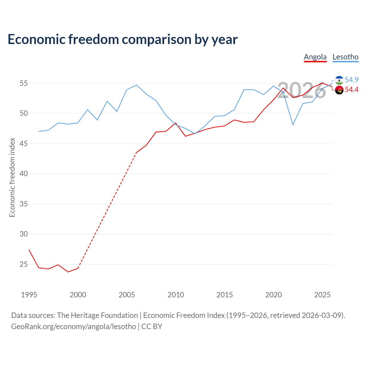 The Economic Freedom Index for Angola is 54.4, ranking 133/197, compared to 54.9 for Lesotho, ranking 130/197. The chart above displays a comparison of annual changes in economic freedom indexes.