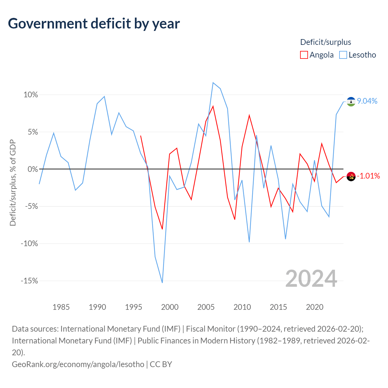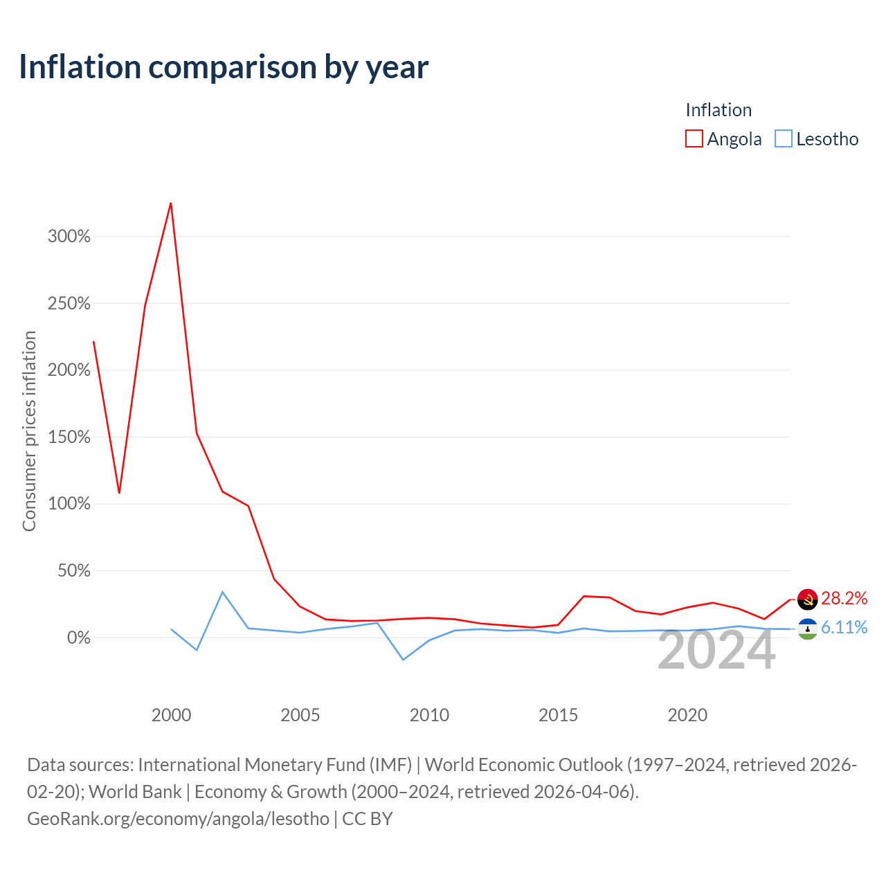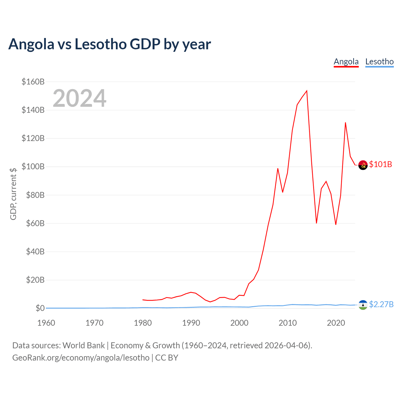 Angola has a GDP of $101B compared to $2.27B for Lesotho, ranking 71/197 and 175/197 by economy size, respectively.