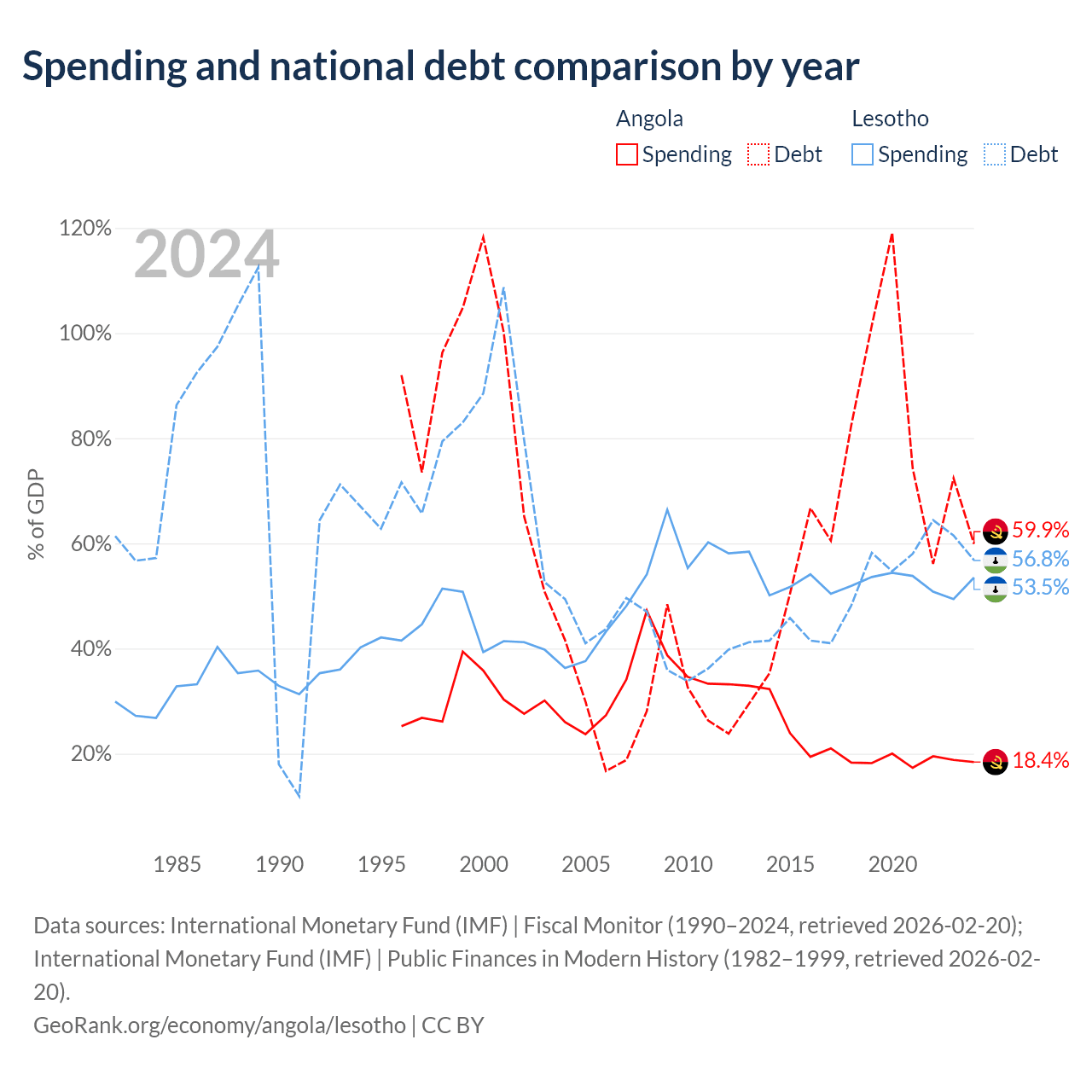 Angola has $60.5B in government debt (59.9% of GDP), compared to $1.29B (56.8% of GDP) in Lesotho.