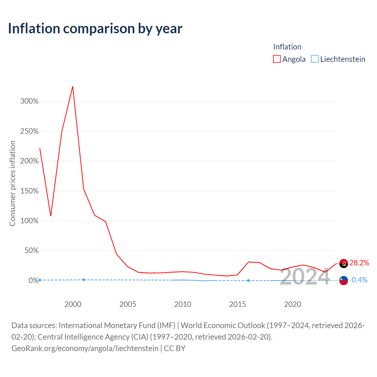 Over the past 24 years, Angola has recorded an average annual inflation rate of 65.1%, compared with 0.04% in Liechtenstein. In 2020, inflation was 28.2% in Angola and -0.4% in Liechtenstein.