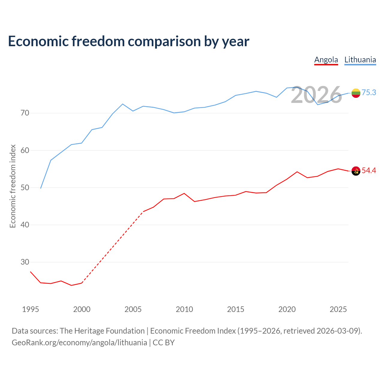 The Economic Freedom Index for Angola is 54.4, ranking 133/197, compared to 75.3 for Lithuania, ranking 18/197. The chart above displays a comparison of annual changes in economic freedom indexes.